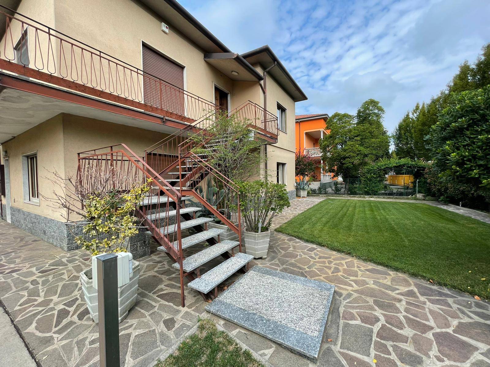 Villa bifamiliare circondata da giardino esclusivo di 300 mq, libera su 4 lati! Composta da due appartamenti speculari entrambi serviti da ingresso indipendente e collegati tra loro attraverso scala interna, composti da soggiorno luminoso, sala da pranzo con cucina abitabile, lungo corridoio che conduce alla zona notte, due camere da letto matrimoniali, bagno con vasca. A completare la soluzione locale cantina e box doppio!