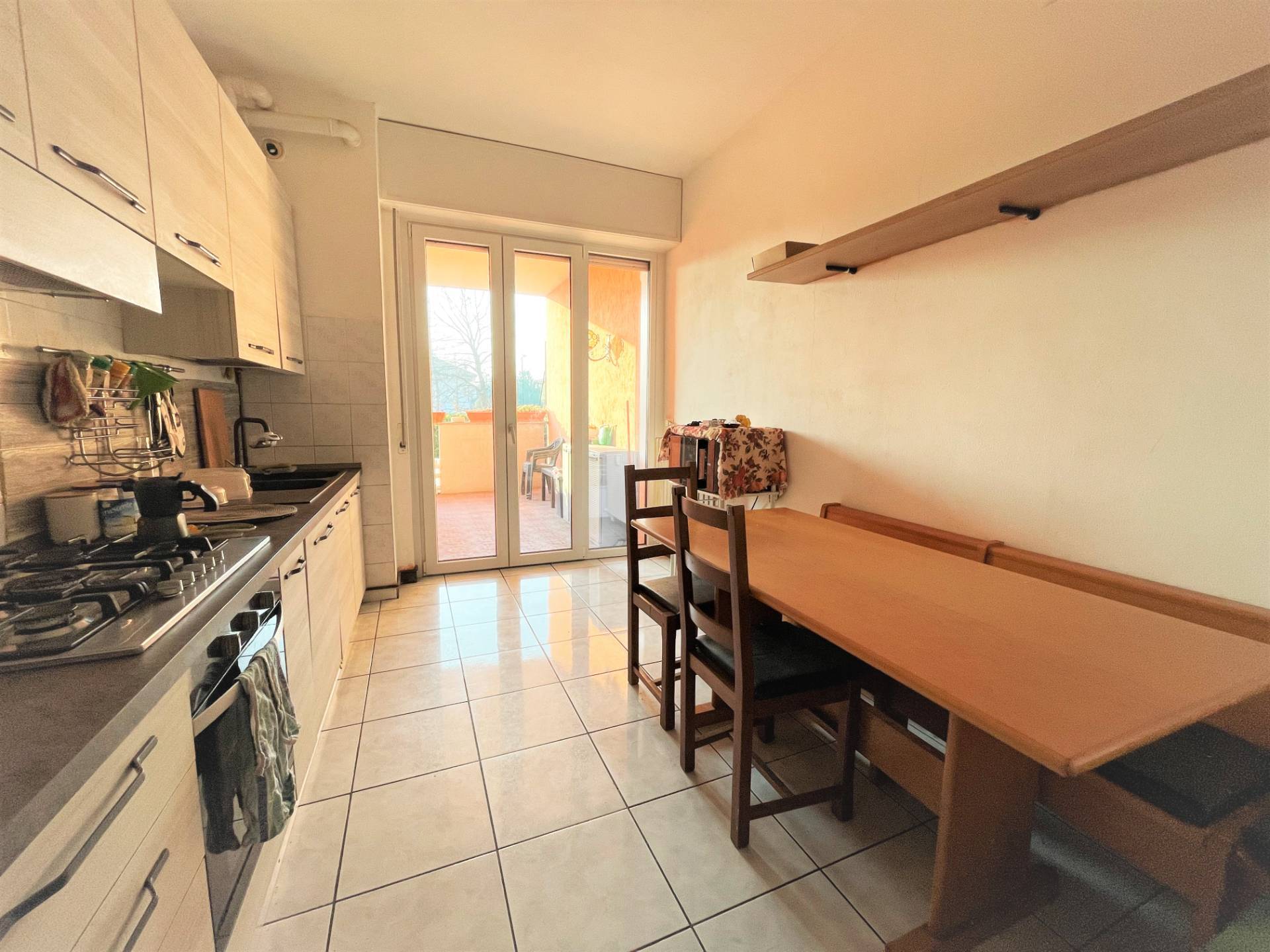 L'appartamento è composto da soggiorno con affaccio su primo terrazzo, cucina separata abitabile con affaccio su secondo terrazzo vivibile, ripostiglio, disimpegno notte che accede alle due camere da letto grandi e bagno completamente ristrutturato. Cantina inclusa nel prezzo!