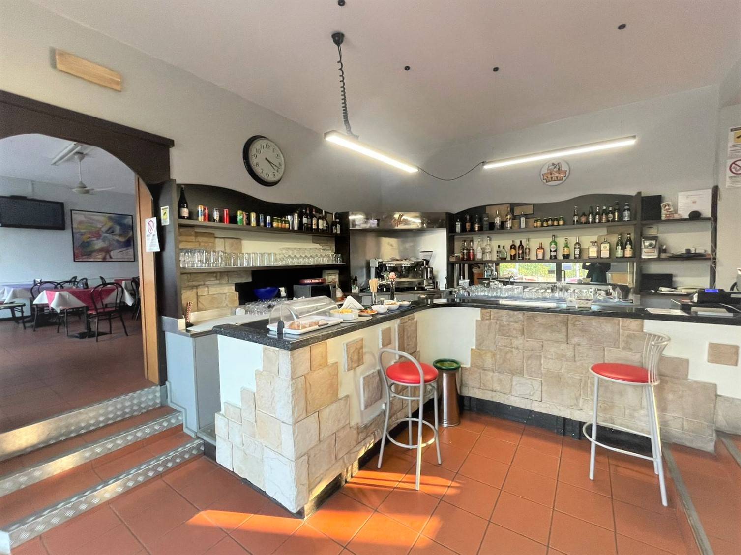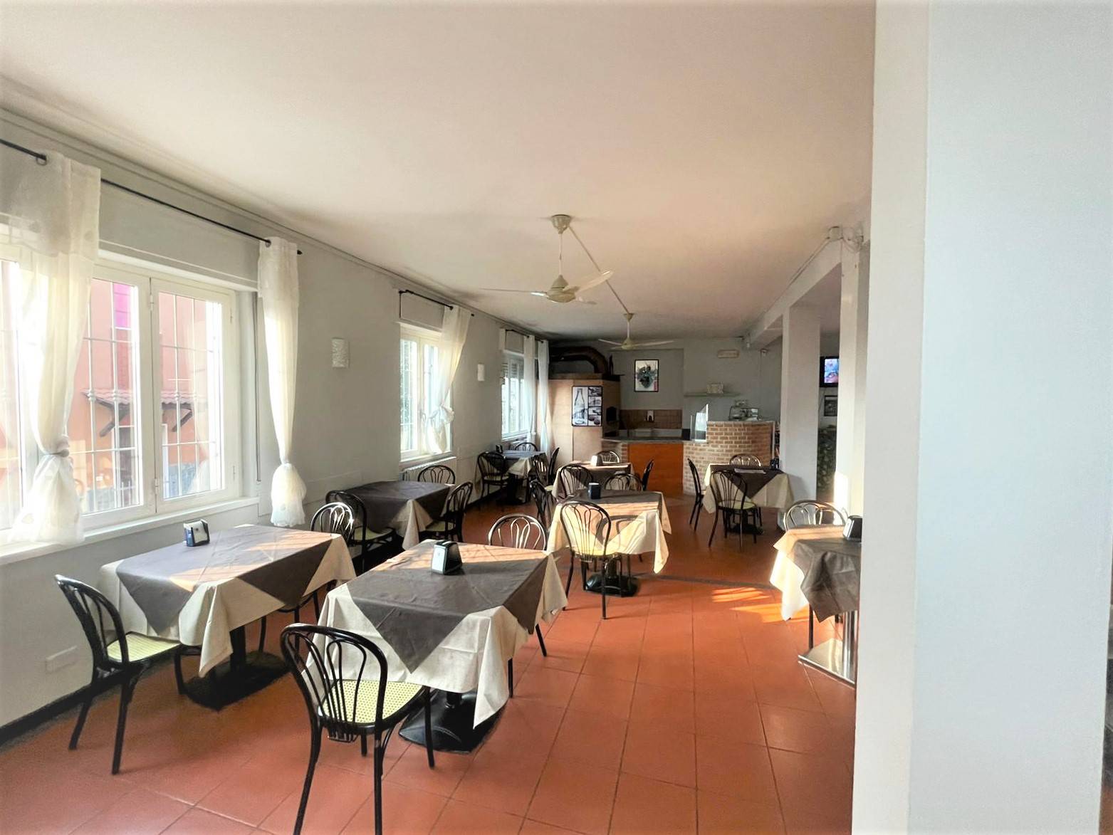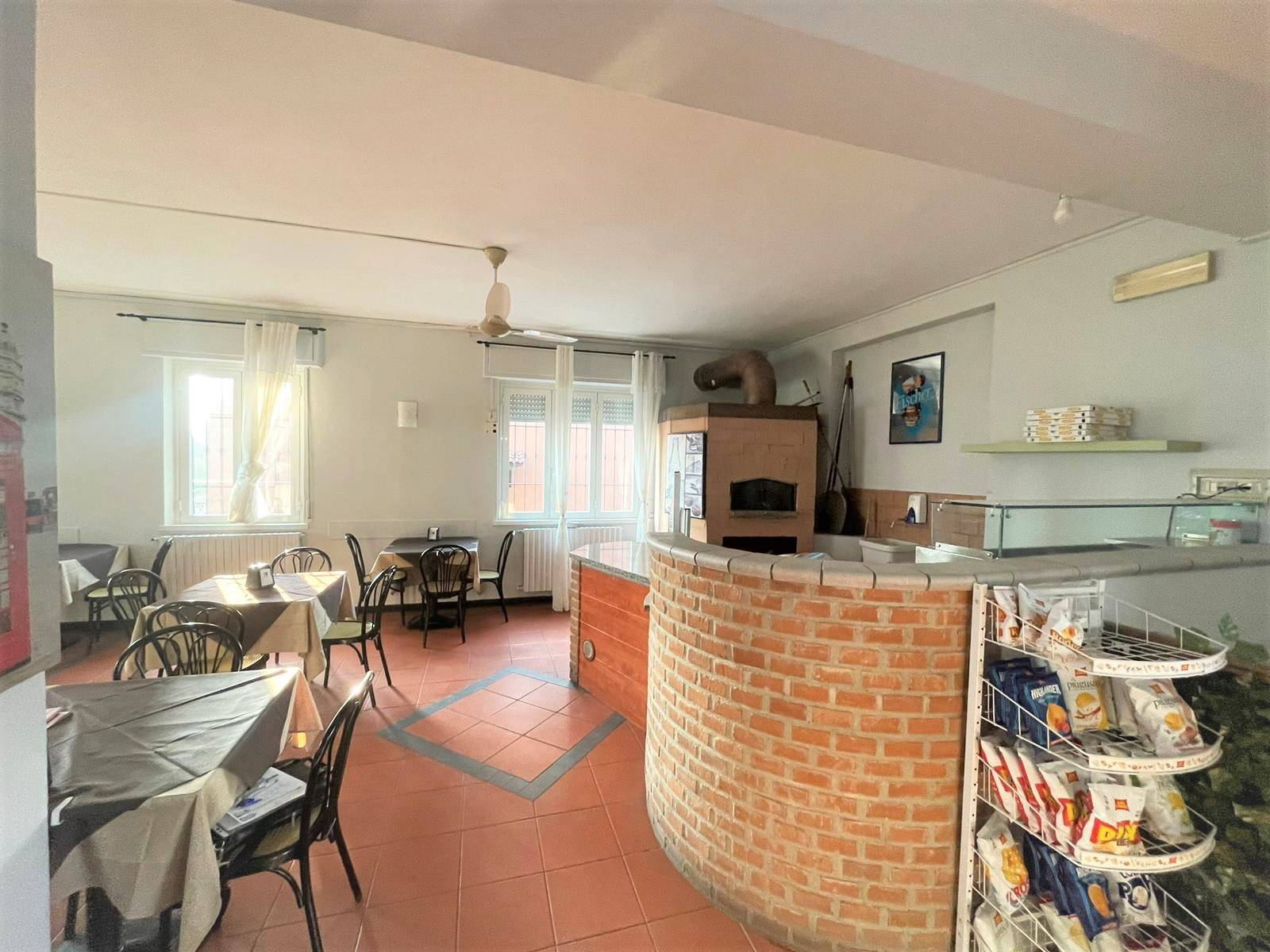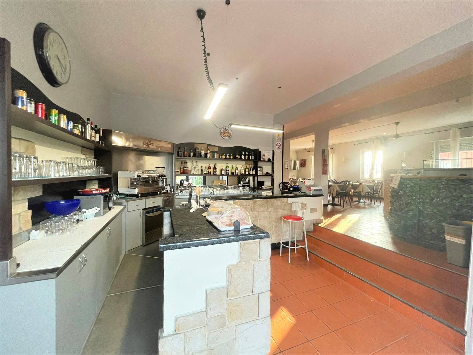 L'immobile è adibito all'ingresso a bar/caffetteria, successiva area dedicata all'attività di ristorazione con ampia e luminosa sala e infine ulteriore sala per aspetti ludici con televisori e slot machine. Già completa di tutto il necessario per il ripristino dell'attività di ristorazione (cucina industriale, forno a legna...)!!!