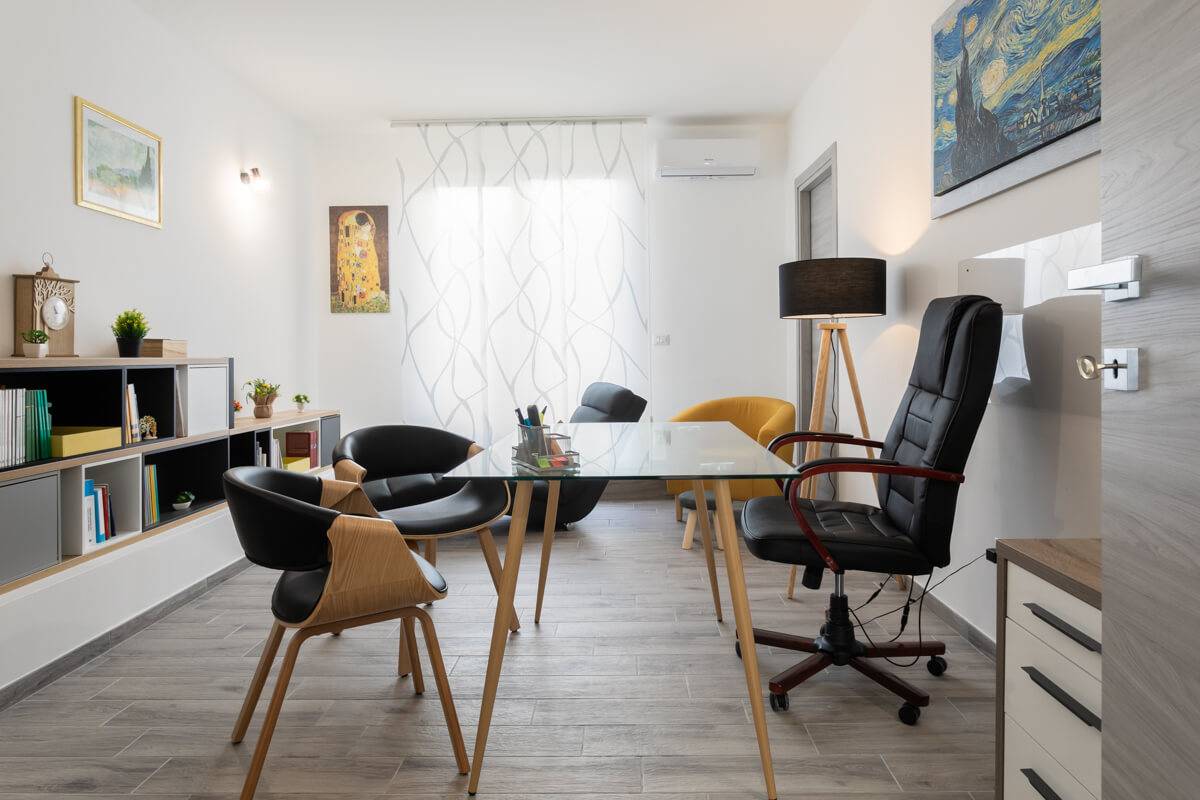 L'ufficio è disposto su due livelli e si presa al ricevimento pubblico (bar, tabaccheria o altre attività commerciali), composto da ingresso con ampio disimpegno e sala d'aspetto, seconda sala con bagno e cucinino/ripostiglio; al piano interrato magazzino di 28 mq ideale anche per realizzare sala riunioni.