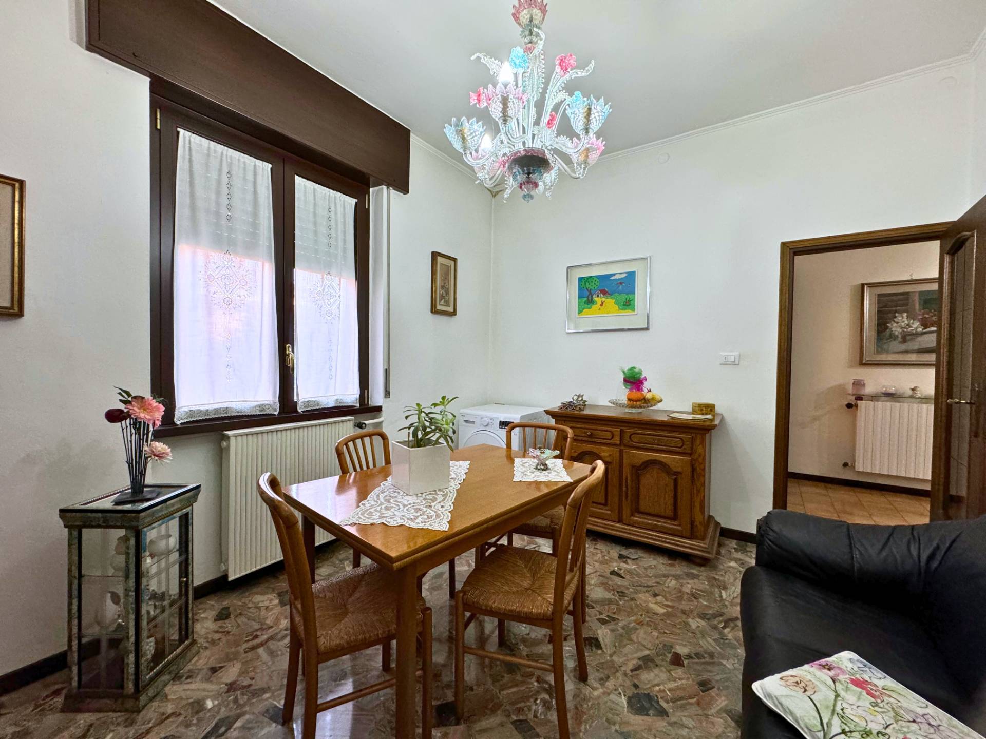 Appartamento Piano Terra: si accede all'ingresso che conduce alla sala e alla cucina separata ed abitabile dotata di balcone. La zona notte è composta dalla camera da letto matrimoniale di grandi dimensioni che presente uno stupendo pavimento d'epoca in parquet, la seconda camera matrimoniale è molto spaziosa ed infine completa il bagno con la vasca e la doccia. Questa parte della casa nasce nel 1955 ed inseguito è stata rialzata per creare il primo piano.