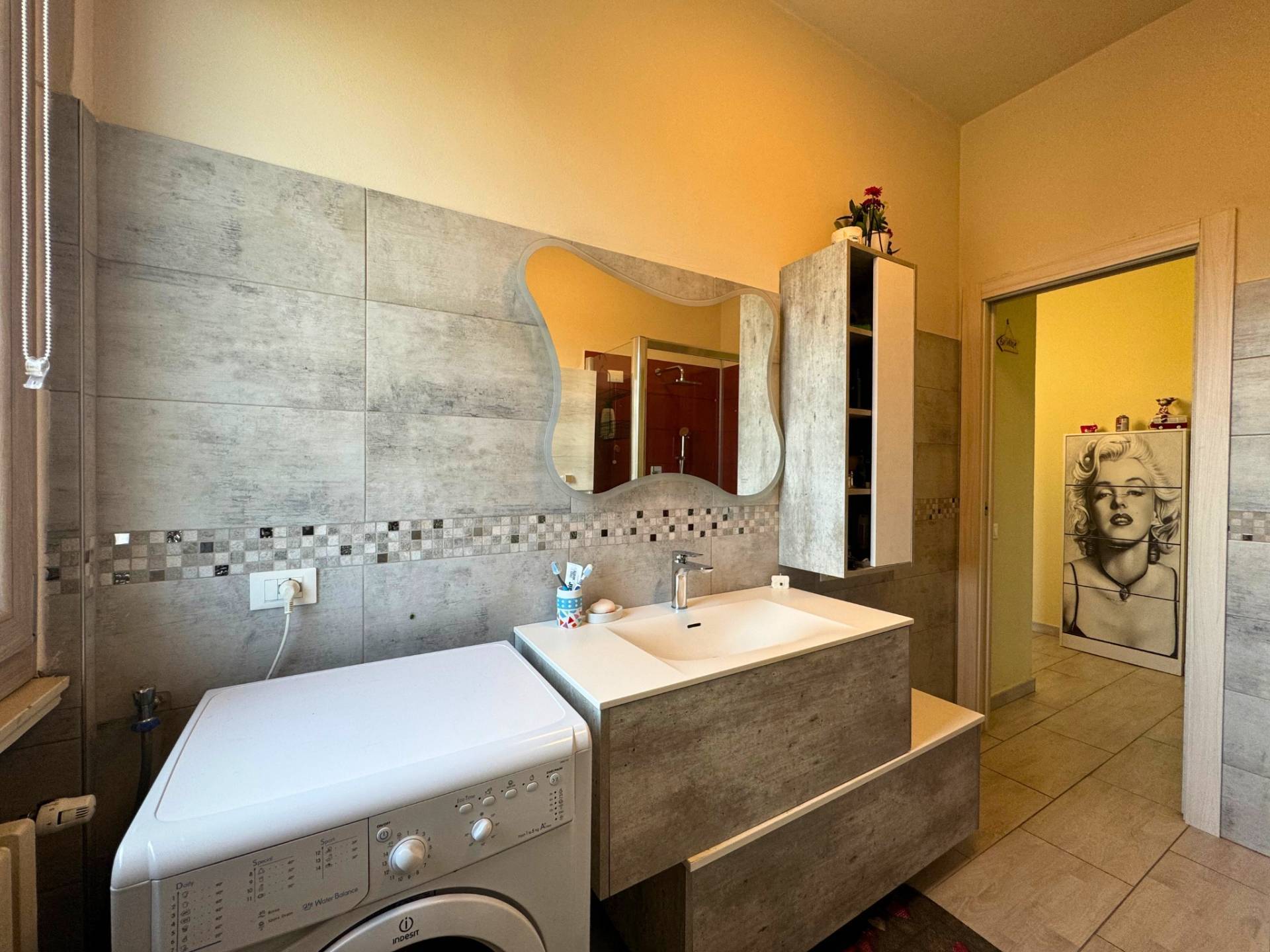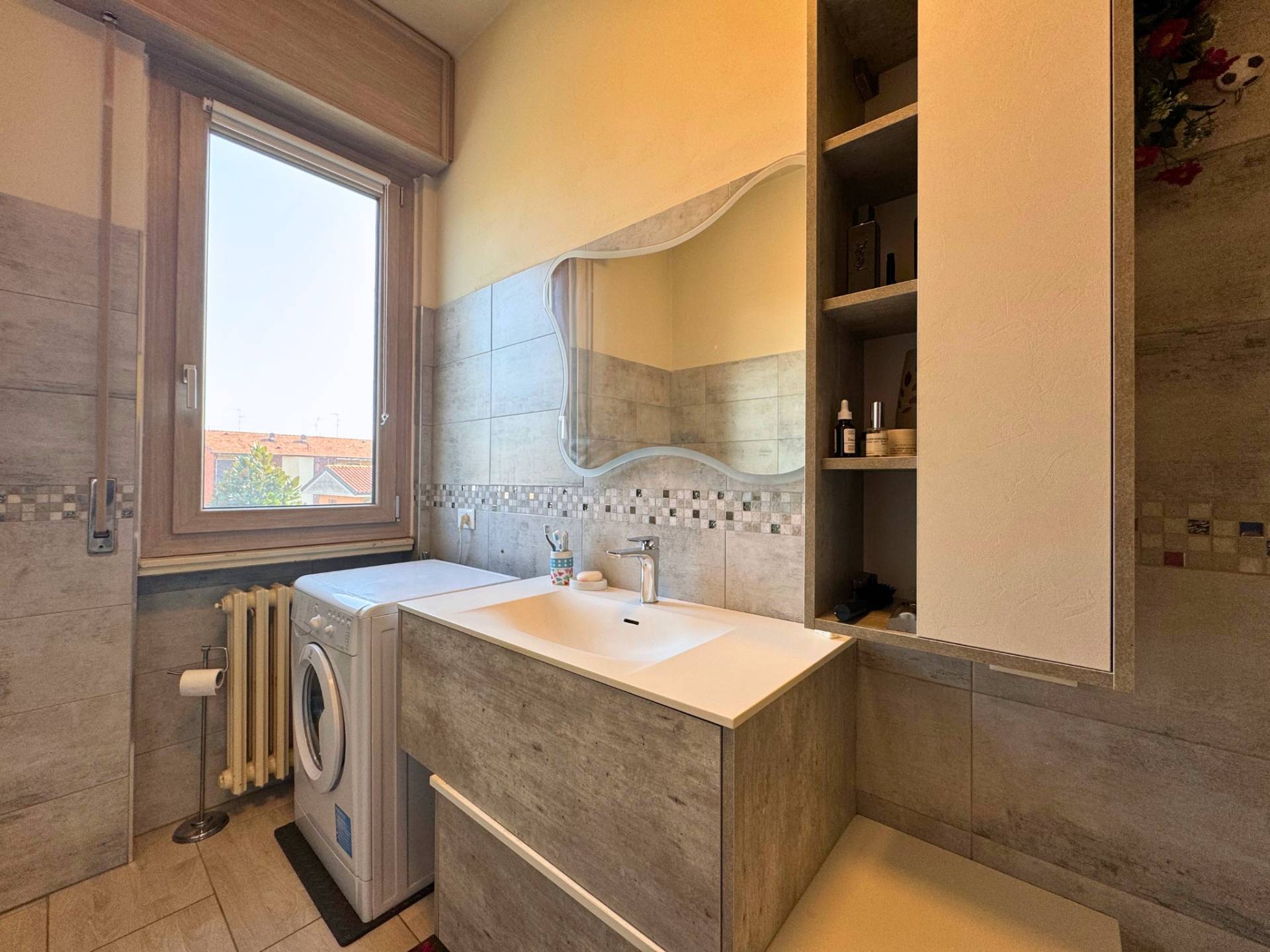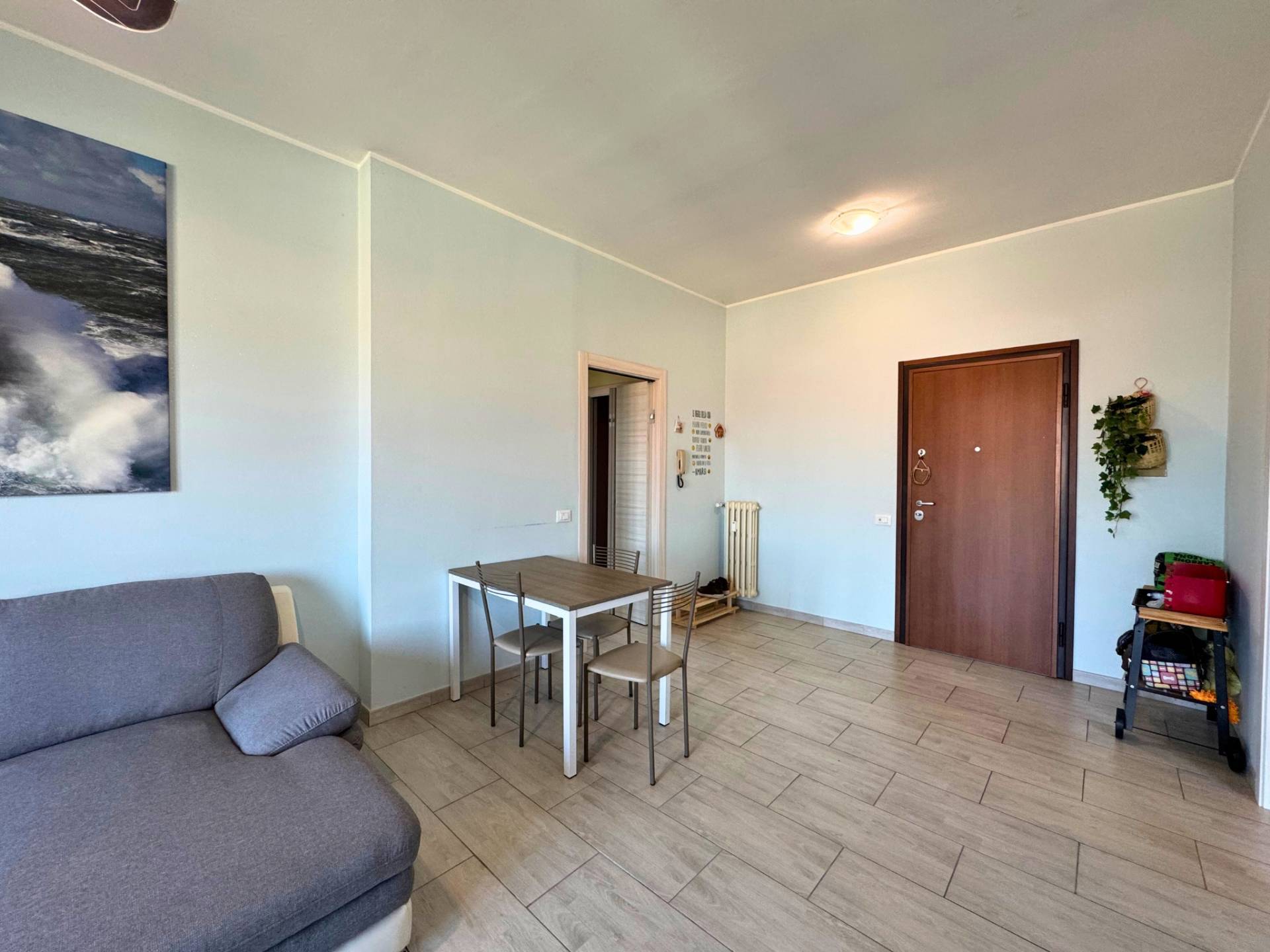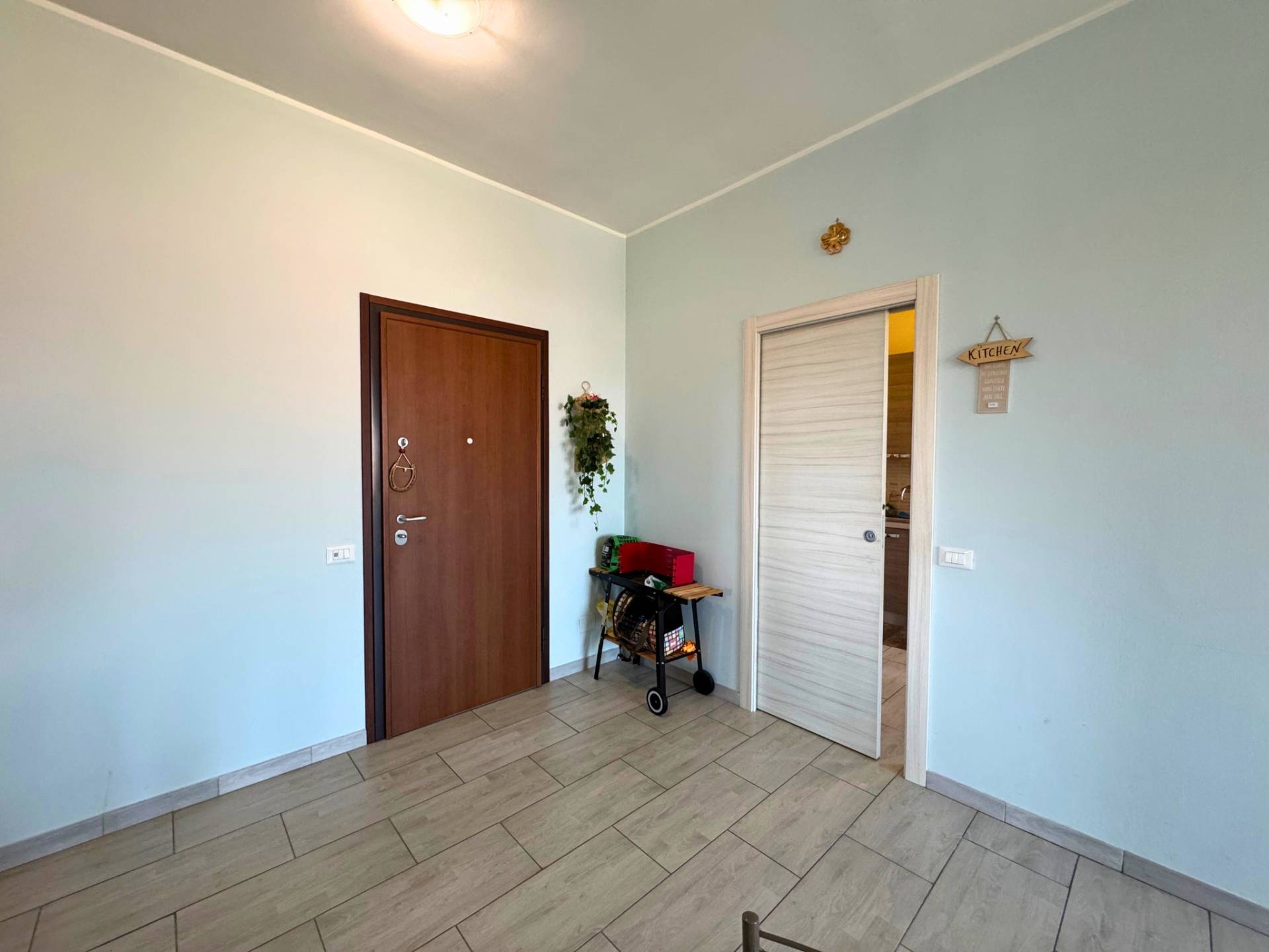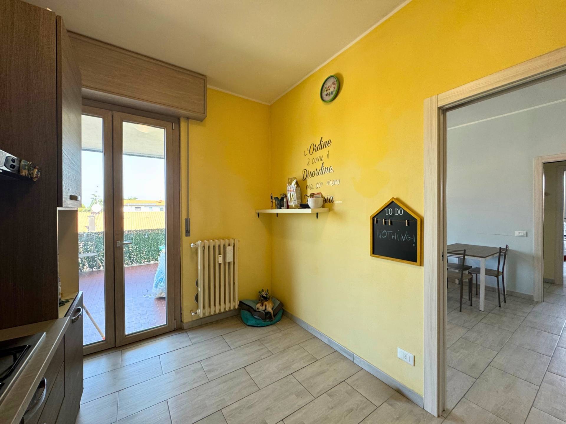 Si accede all'immobile tramite la porta blindata che accede alla sala di generose dimensioni con spazio living molto luminoso grazie alla porta finestra con accesso al balcone. La cucina è separata ed abitabile con accesso al terrazzo dove è possibile mangiare fuori nelle piacevole giornate primaverili. La dimensione del terrazzo consente di mettere un tavolo o una piacevole zona living esterna.