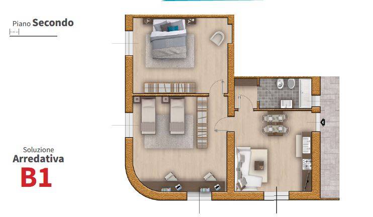 L'immobile è composto da ingresso su cucina/soggiorno, disimpegno e bagno con doccia, un ampio soggiorno e due camere da letto matrimoniali di ampie dimensioni;
