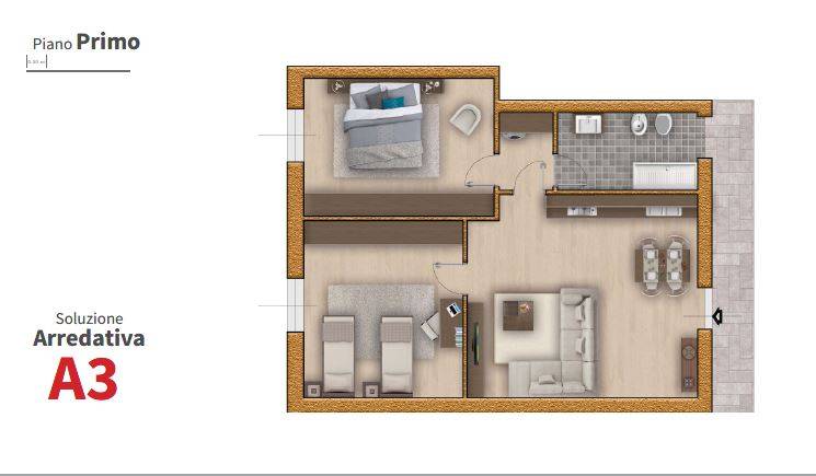 L'immobile è composto da ingresso su cucina con disimpegno e bagno con doccia, un ampio soggiorno e una camera da letto matrimoniale;