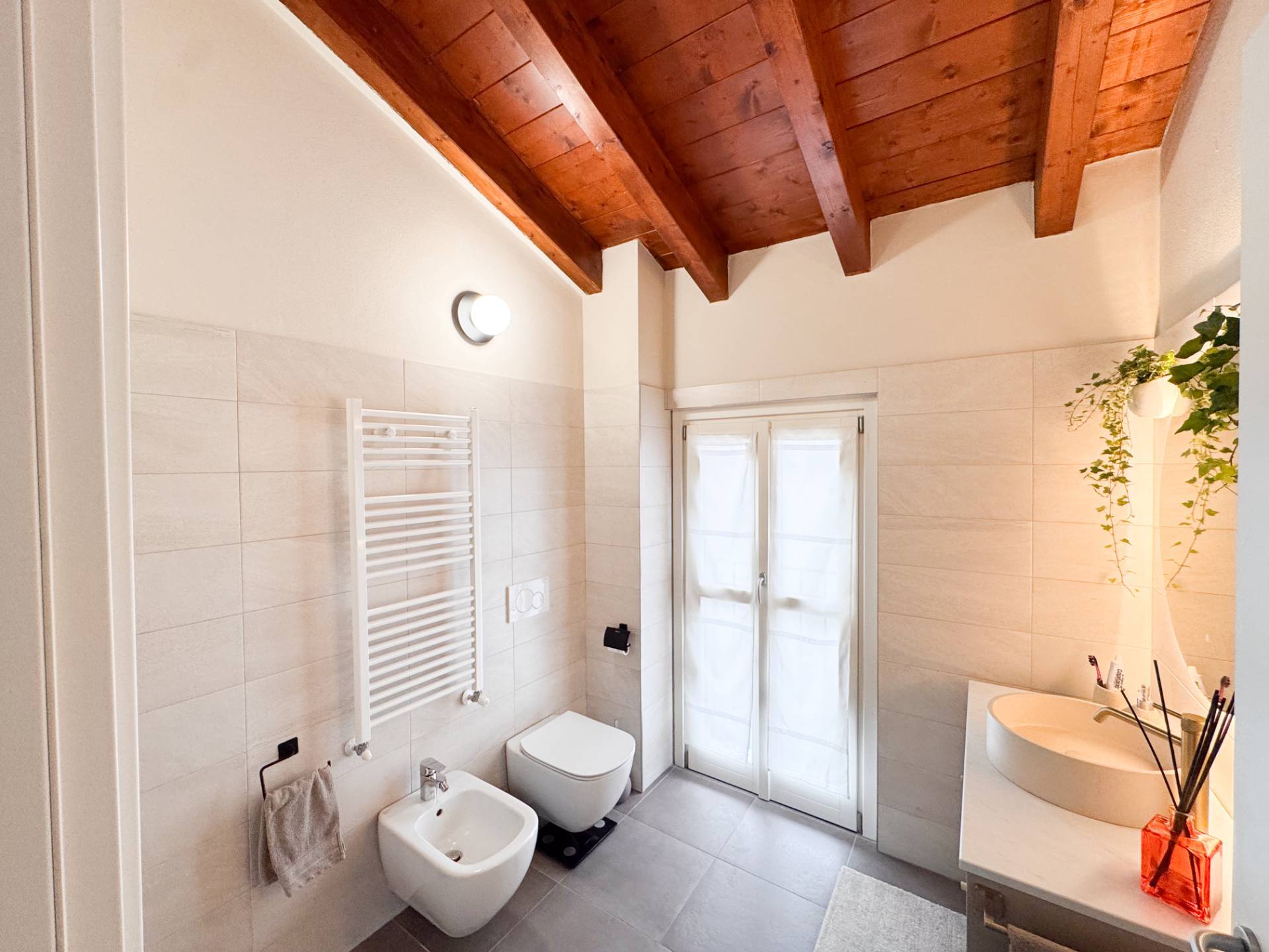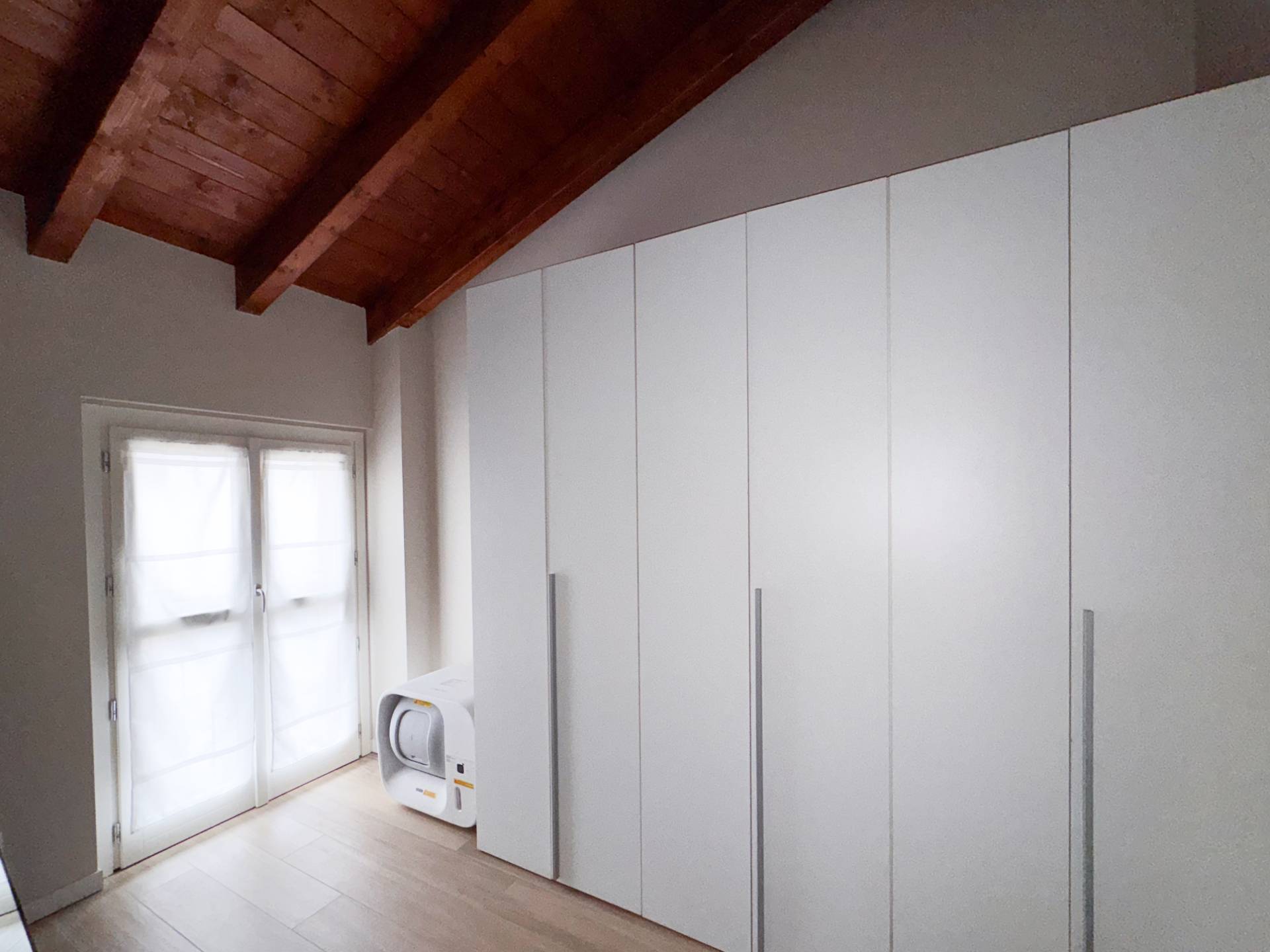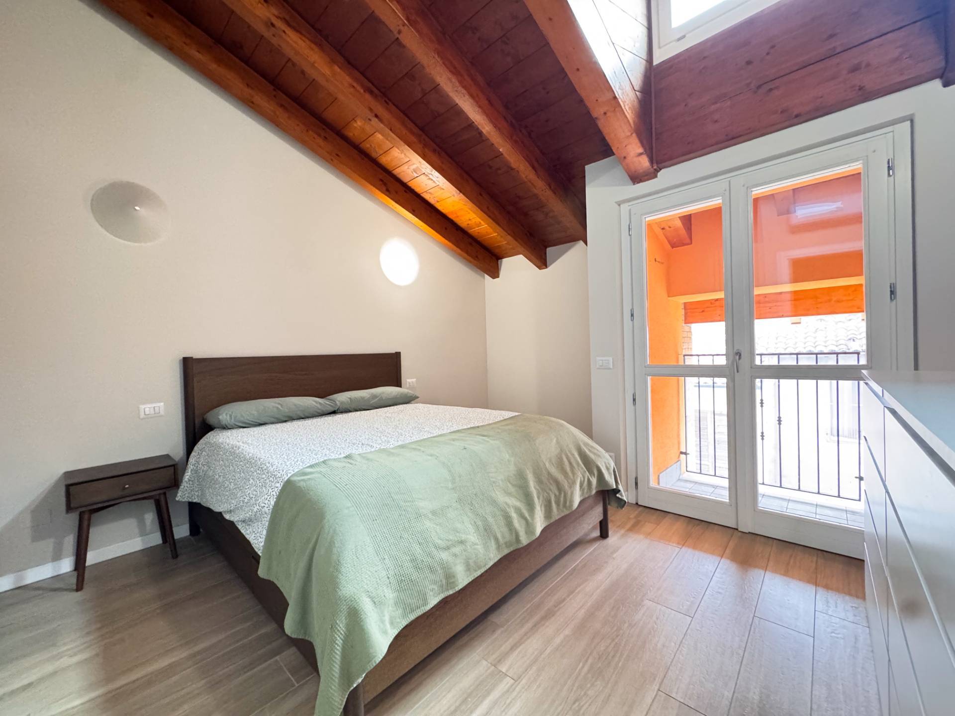 Dal soggiorno, attraverso una scala in marmo, si accede al piano superiore, caratterizzato da travi a vista e da una notevole luminosità garantita da grandi vetrate. La zona notte ospita una camera matrimoniale con accesso a una loggetta, una seconda camera singola attualmente adibita a cabina armadio e un secondo bagno, arredato con cura e dotato di ampia doccia. In tutti gli ambienti sono presenti pavimenti in ceramica di prima scelta effetto parquet in rovere chiaro.
