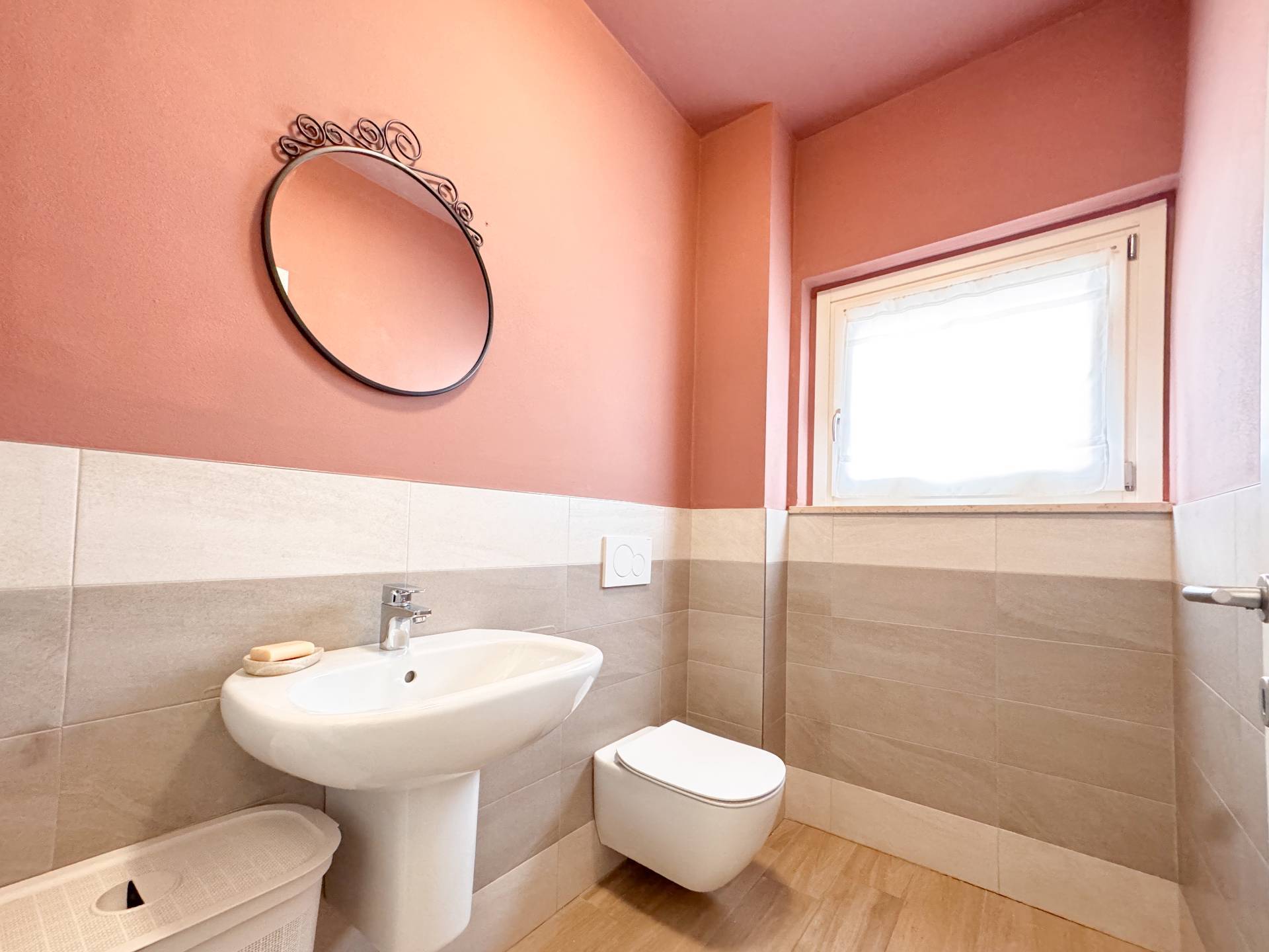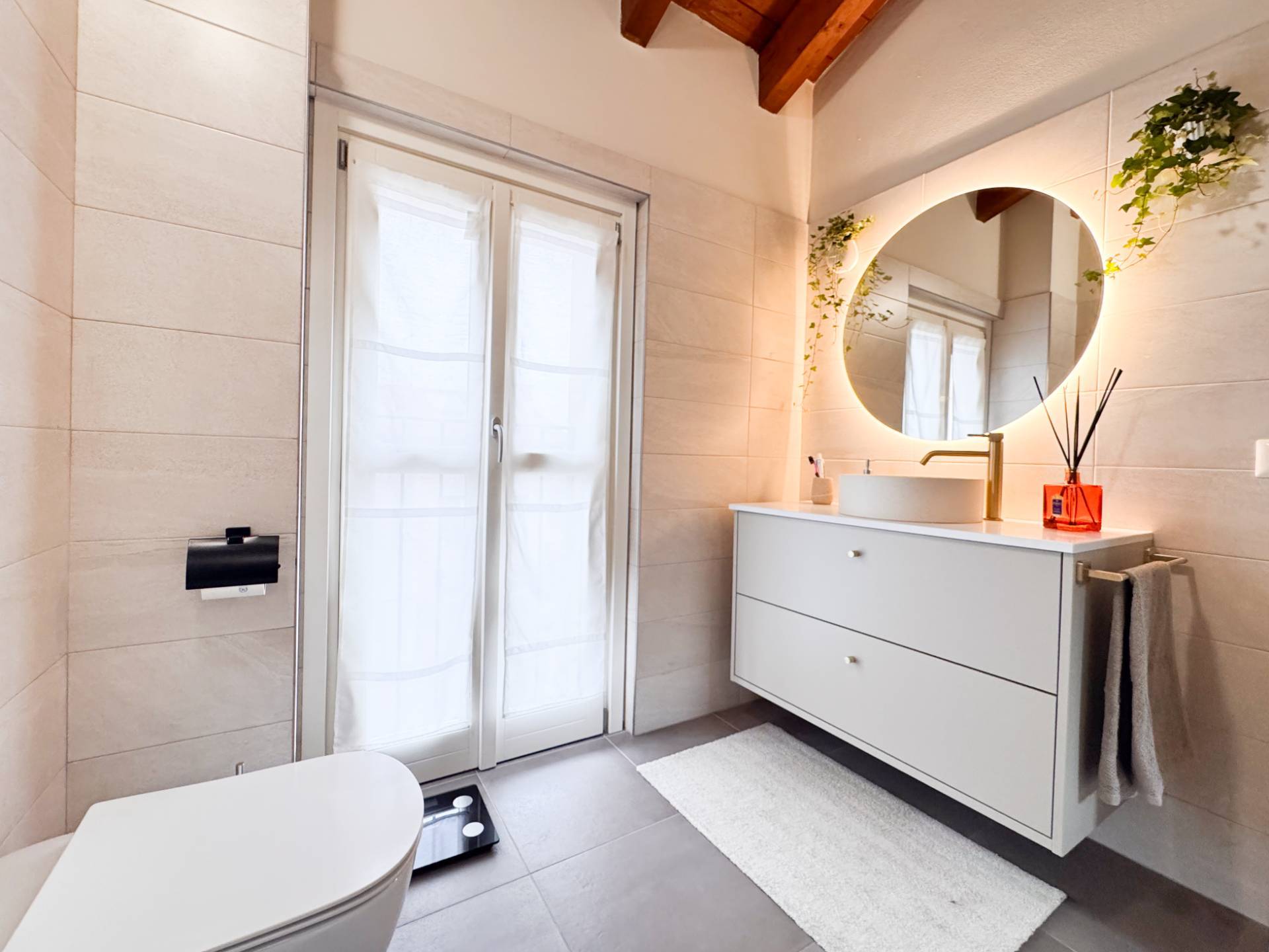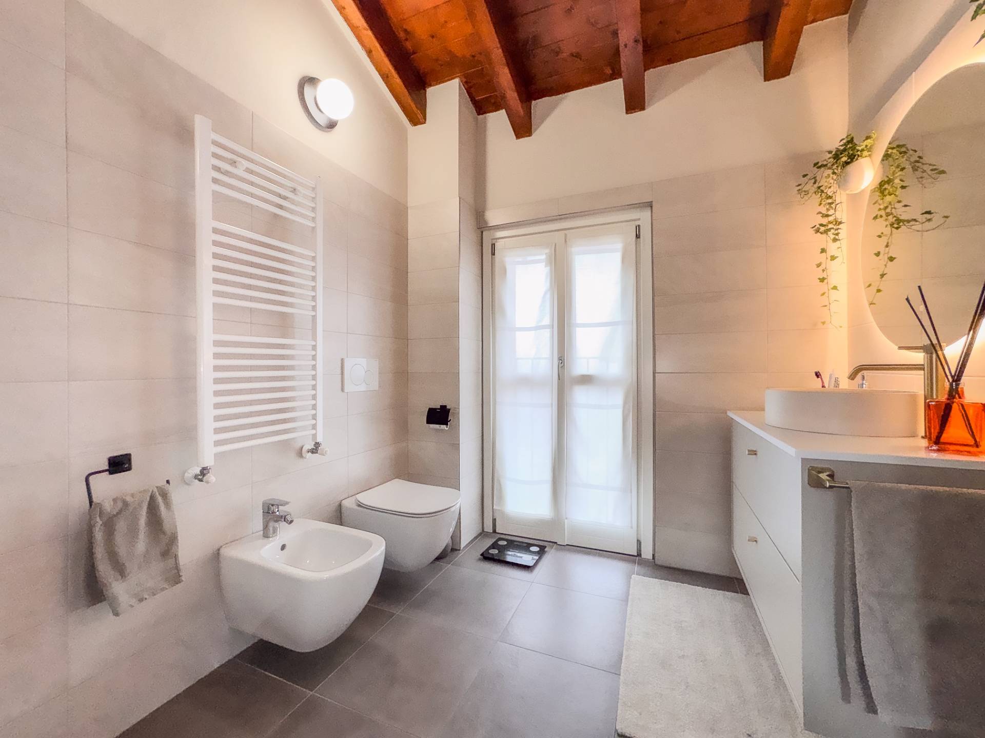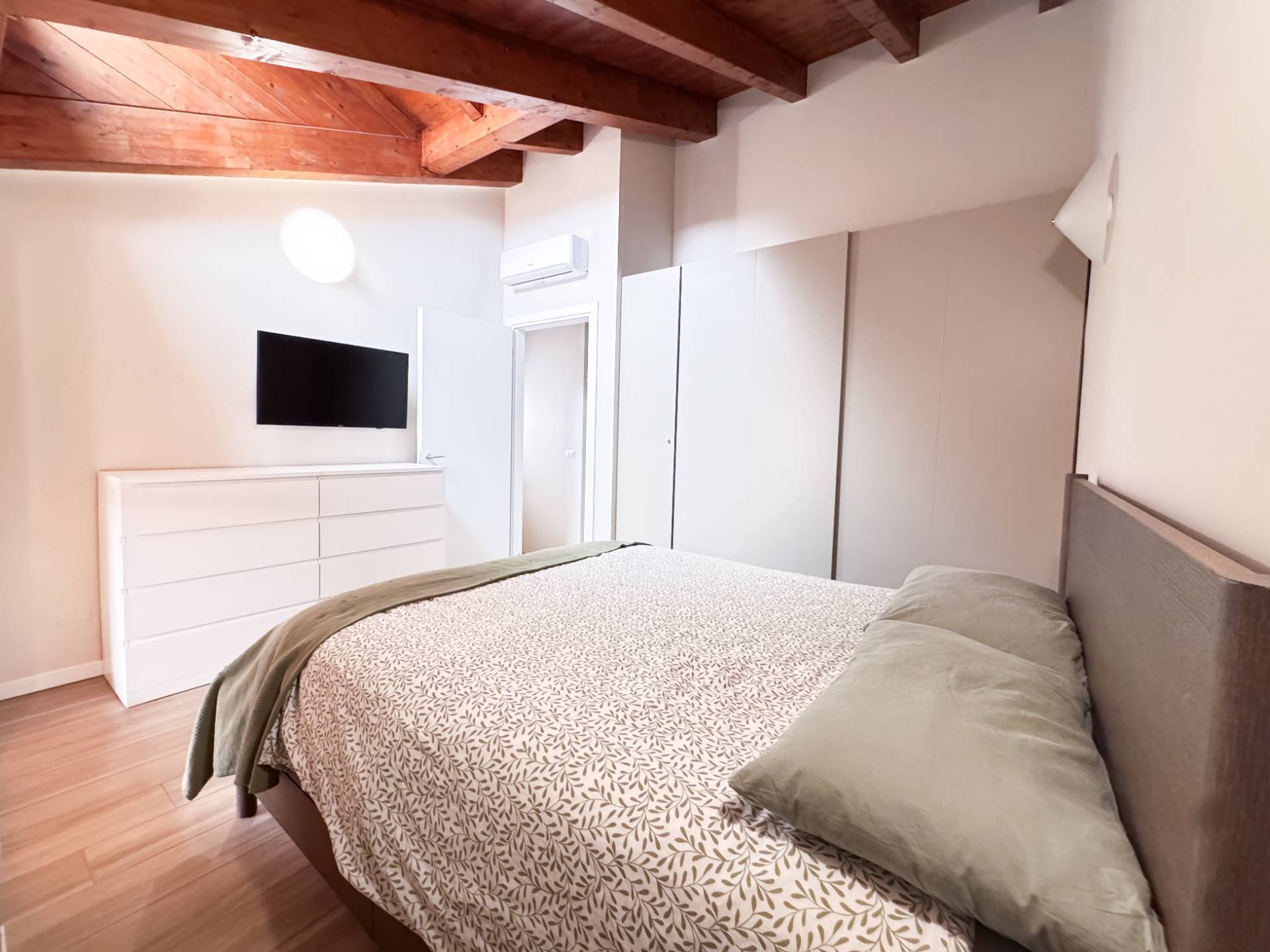 Dal soggiorno, attraverso una scala in marmo, si accede al piano superiore, caratterizzato da travi a vista e da una notevole luminosità garantita da grandi vetrate. La zona notte ospita una camera matrimoniale con accesso a una loggetta, una seconda camera singola attualmente adibita a cabina armadio e un secondo bagno, arredato con cura e dotato di ampia doccia. In tutti gli ambienti sono presenti pavimenti in ceramica di prima scelta effetto parquet in rovere chiaro.